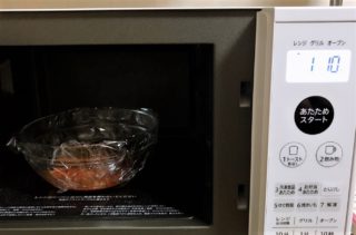 ③ふんわりとラップをかけ、電子レンジ500wで1分10秒加熱する。(600wなら1分加熱)