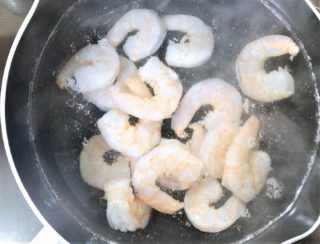 ④ぐらぐらしない程度のお湯で、むきえびを1分ほどゆでる。身が白っぽくなったらザルに上げて水気を切る。