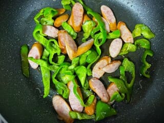 ②ウインナー、ピーマン、たまねぎは食べやすく切り、油をひいたフライパンで炒める。