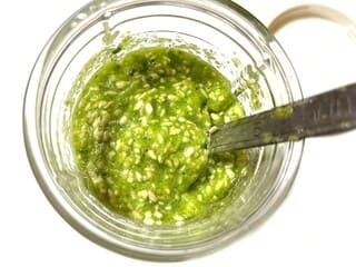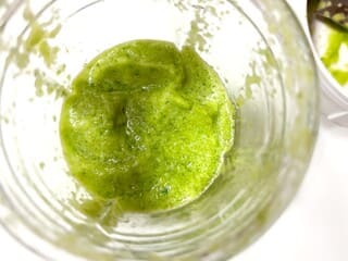 ④野菜ペーストに加えて、塩がとけるようにスプーンでしっかり混ぜる。