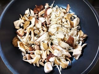 ①きのこは粗みじん切りにしてフライパンに入れる。
