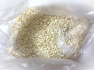 ④ポリ袋に米麹、塩を入れてすり混ぜる。