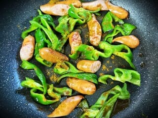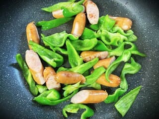 ①ウインナー、ピーマンは食べやすい大きさに切り、油をひいたフライパンで炒める。