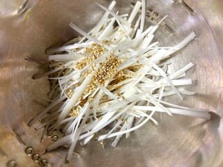 ⑤細切りにしたネギ、塩、ごま油、ごまを混ぜ合わせる。
