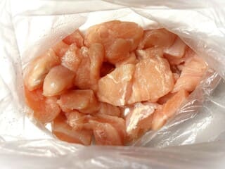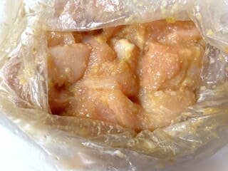 ①鶏肉はお好みで皮を取り、一口大に切ってポリ袋に入れる。