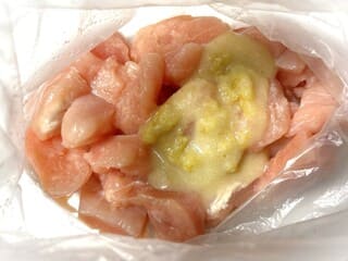 ②麹調味料を加え、袋の上からもんで全体になじませる。