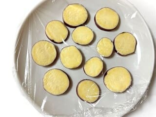 ①さつまいもは輪切りにして、サッと水でぬらす。