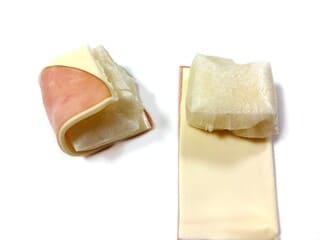 ④ハムにスライスチーズを重ね、半分に切る。