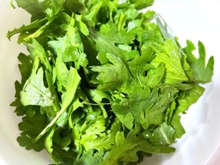 ①春菊は良く洗って水気を切り、葉をつむ。