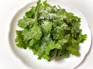 やわらかい春菊の葉に粉チーズとドレッシングが絡んでおいしいです。